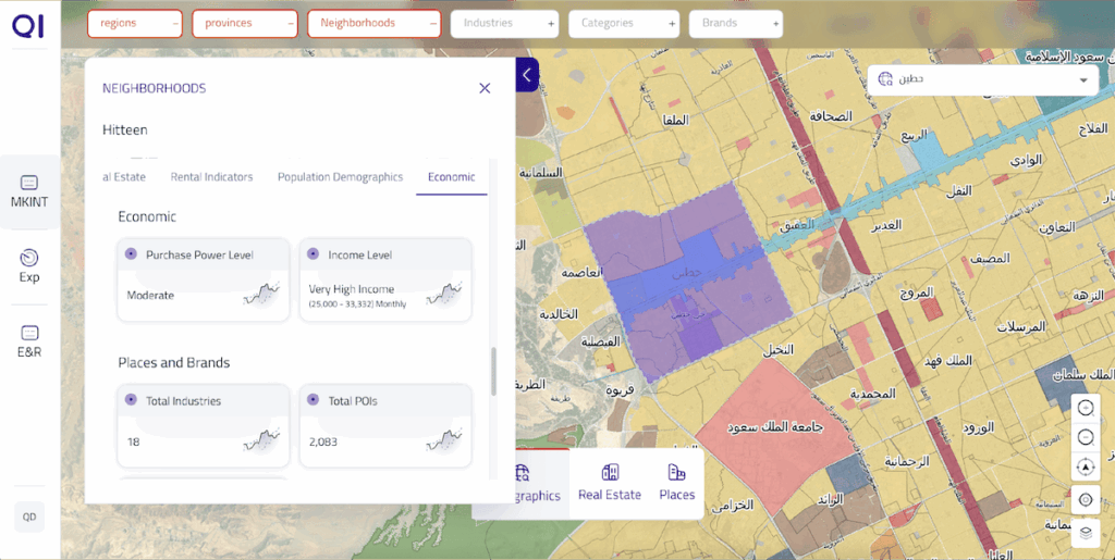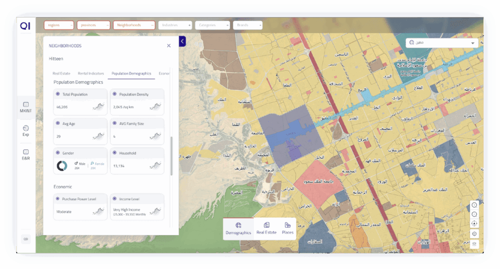التوسع الذكي يعتمد على قرارات استراتيجية متعلقة بالموقع، وجوهر هذه الاستراتيجية هو تحليل الفئة المستهدفة. فمعرفة عدد السكان لم تعد كافية، بل يجب أن تعرف من هم هؤلاء الناس، كيف يعيشون، ما مستوى دخلهم، وأين ينفقون أموالهم. وهنا يأتي دور منصة QI (Quant Intelligence) لتوفر لك وضوحاً ورؤية مدعومة بالبيانات تعزز ثقتك بخطط التوسع.